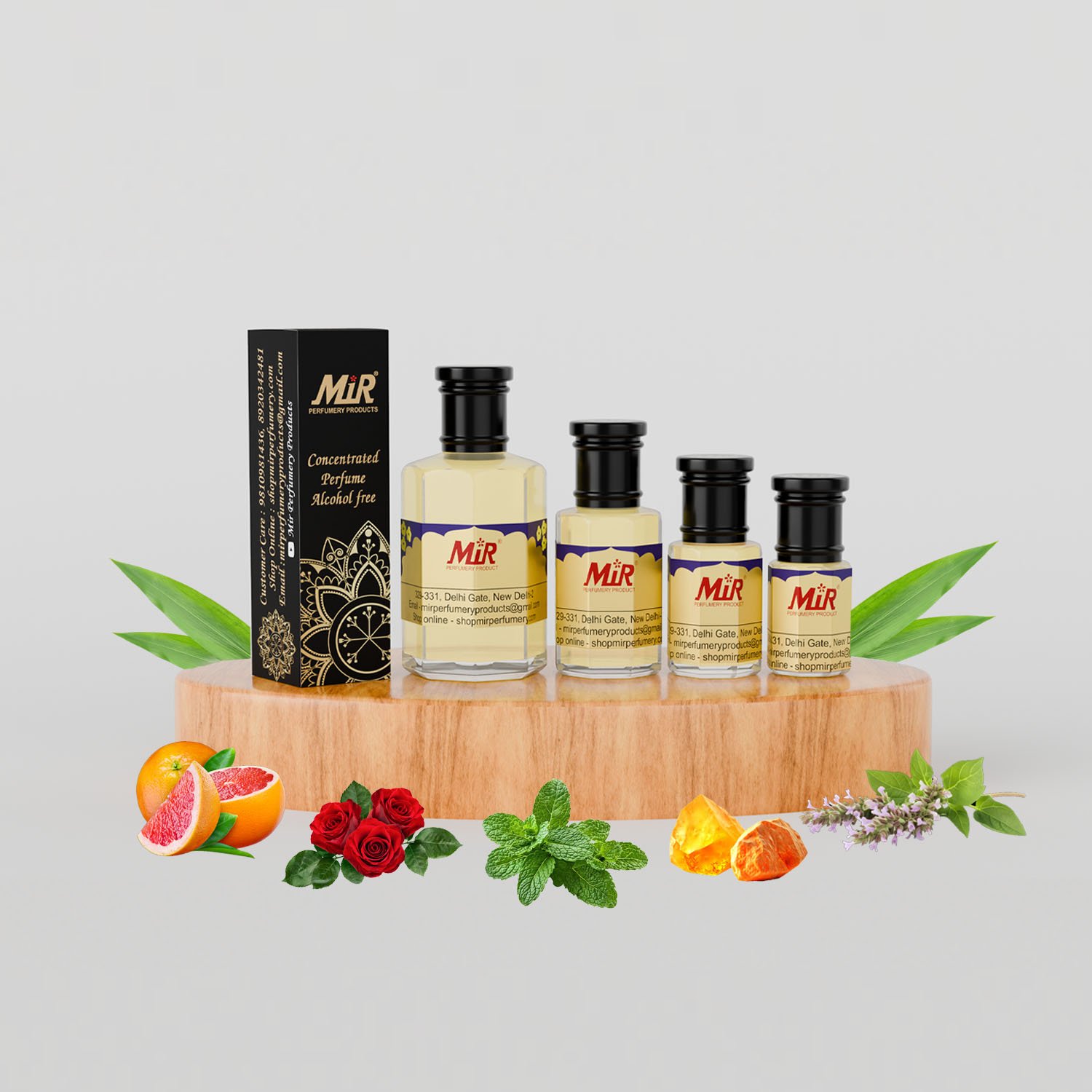 Grapefruit and Mint; middle notes are Cinnamon, Spicy Notes and Rose; base notes are Amber,